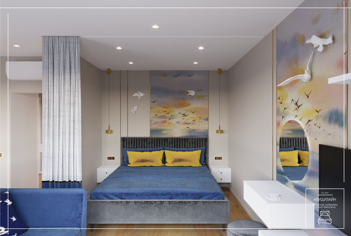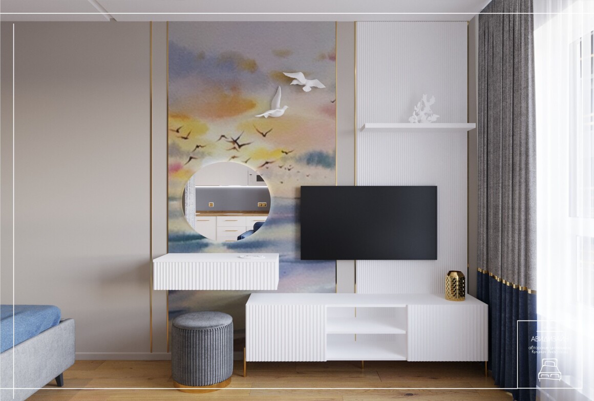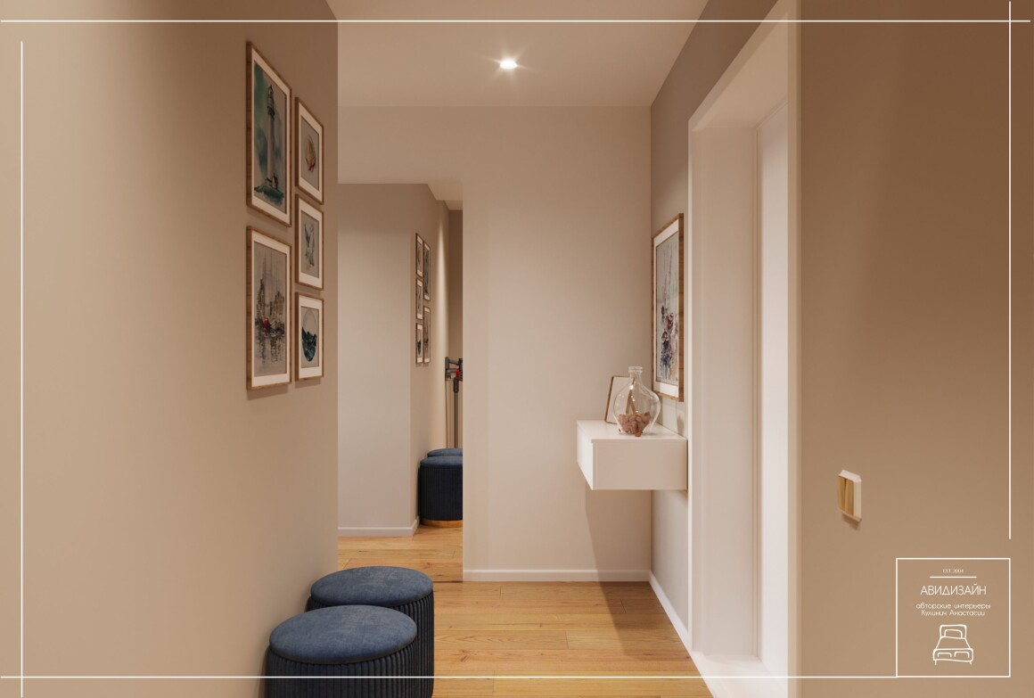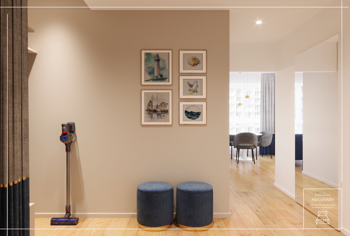 Эта квартира — не просто ремонт, а продуманный образ морского Владивостока. Панно с чайками и закатом над морем, оттенки песка и волн создают атмосферу побережья.